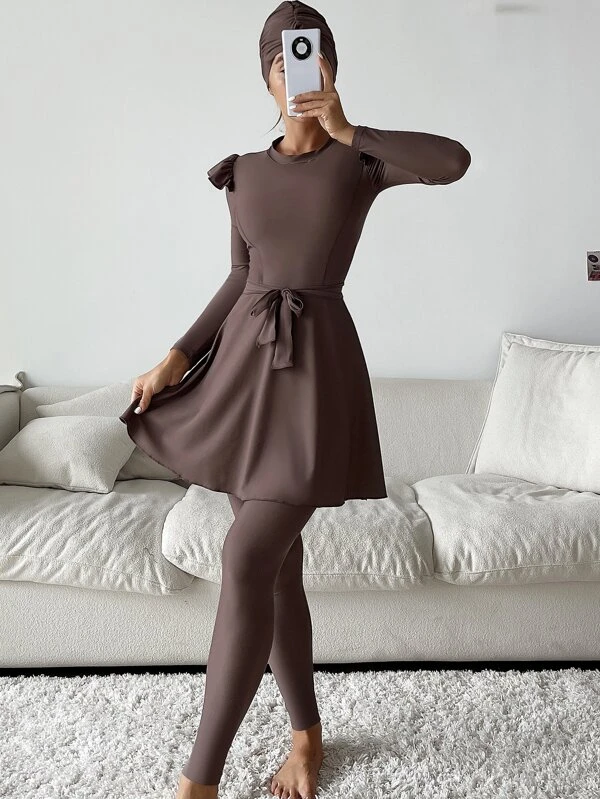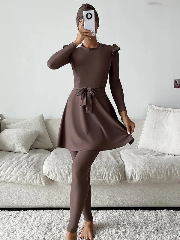 Burkini marron Mono Tankini Ensemble Manches Longues À Volants Long Natation Chemise & Ceinturé Jupe & Legging & Casquette 4 pièces Maillot De Bain